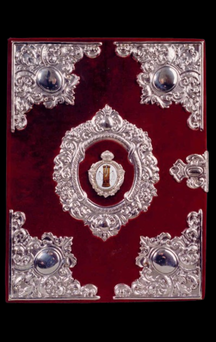 El “Libro de Estatutos” o “Libro de Reglas” realizó su primera salida en el año 2001. Los estatutos son el marco legal por el cual se mueve la Cofradía, y son de vital importancia para su funcionamiento. Es de terciopelo rojo con aplicaciones plateadas. En el centro lleva la medalla de la Cofradía de plata y esmalte, y se lleva sobre una estructura de madera también forrada de terciopelo rojo.